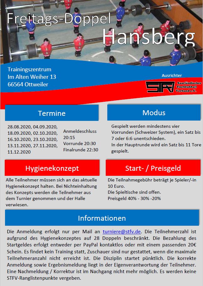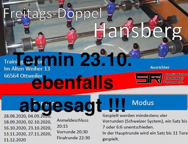 Das nächste Turnier der Hansberg-Serie, am kommenden Freitag, 23.20., fällt ebenfalls der aktuellen Corona-Lage zum Opfer. Für die restlichen Turniere  ab 13.11. wird die Entscheidung auf Anfang November vertagt. Die Hygieneregeln für die Turniere wurden schon mal sicherheitshalber angepasst.