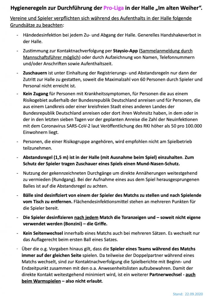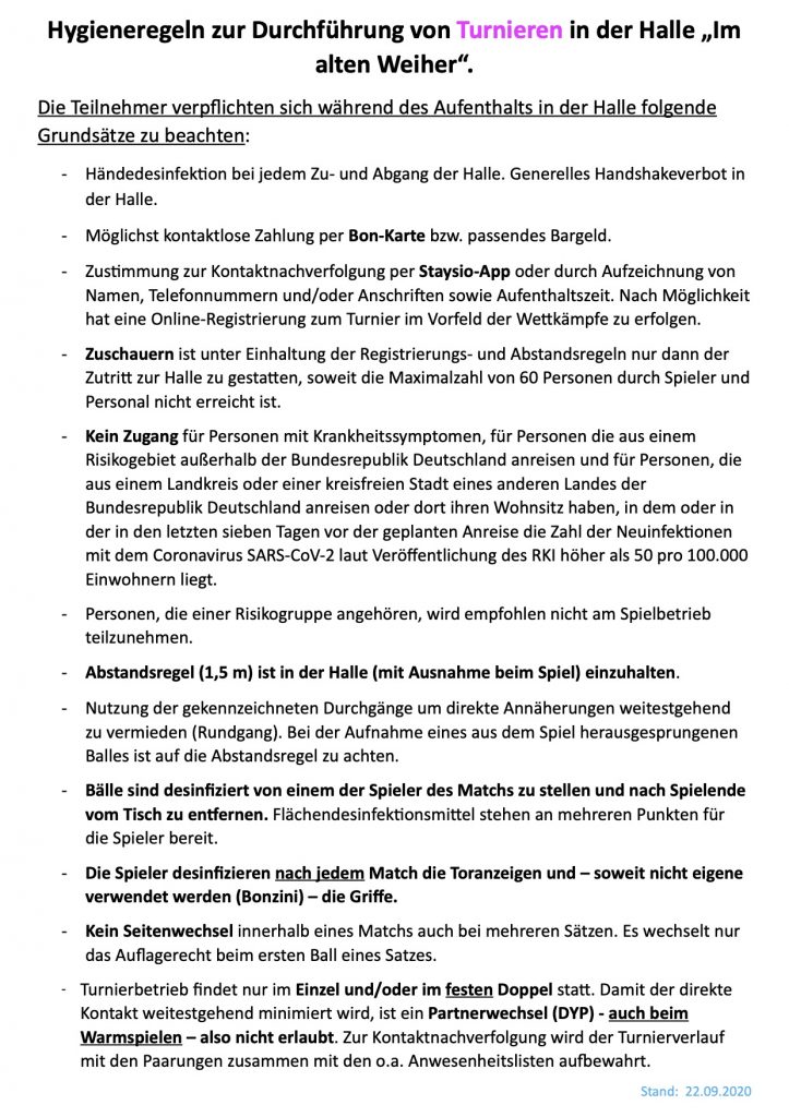 Ab 22.09.20 wurden die Hygieneregeln für den Turnierbetrieb ebenfalls angepasst. Hier die aktuelle Fassung: