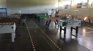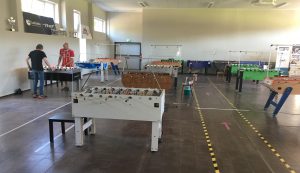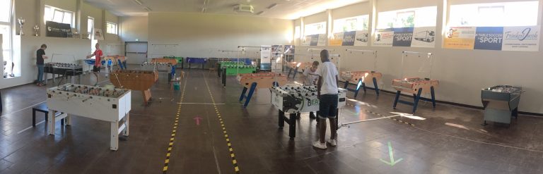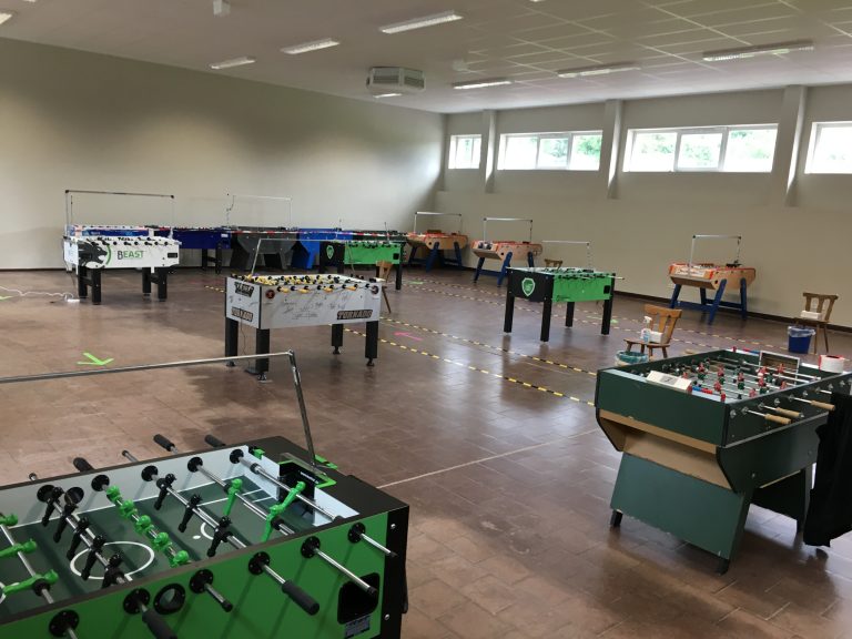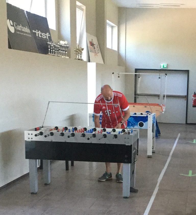 Damit stehen alle „ITSF OFFICIAL TABLES“ fürs Tunier-Training zur Verfügung. Aktuell sind 7 Bonzini, 2 Leonhart und je 1 Garlando, Roberto Sport und Tornado aufgebaut. Mit den zusätzlich trainingsbereiten Ulrich-Beast, 2 Hansberg und dem Prototyp des „Ulrich-Saarland“ warten damit aktuell insgesamt 16 (!!!) Tische auf trainingswillige Akteure. Wo gibt es das sonst noch ?
