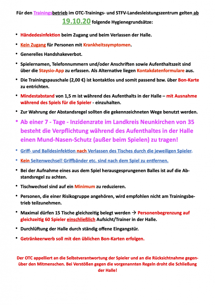 • Maskenpflicht auch am Spiel. Wenn Trennwand am Tisch angebracht ist oder 1 Person alleine trainiert, kann die Maske abgenommen werden.