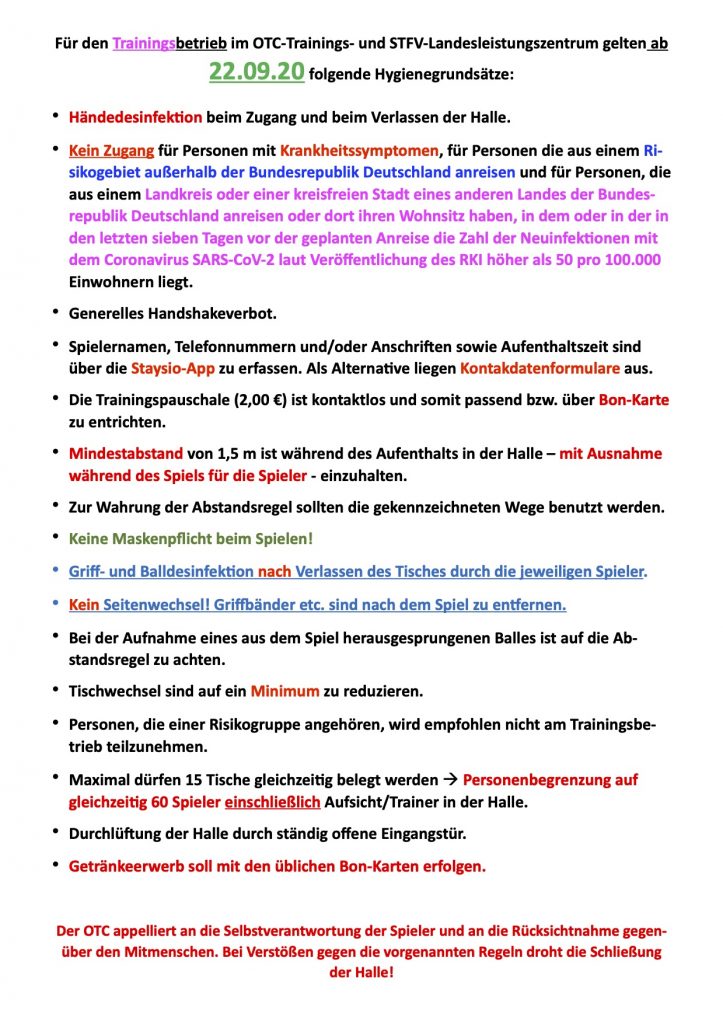 Ab sofort greifen auch die aktualisierten Hygieneregeln für den Spielbetrieb der Pro-Liga. Diese wurden mittlerweile auch den Vereinen per Mail zugestellt. Zu unser aller Schutz und der möglichst ununterbrochenen Durchführung von Trainings-, Turnier- und Spielbetrieb bitten die Verantwortlichen von OTC und STFV um Beachtung. Hier zum Nachlesen: