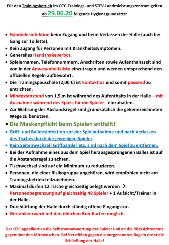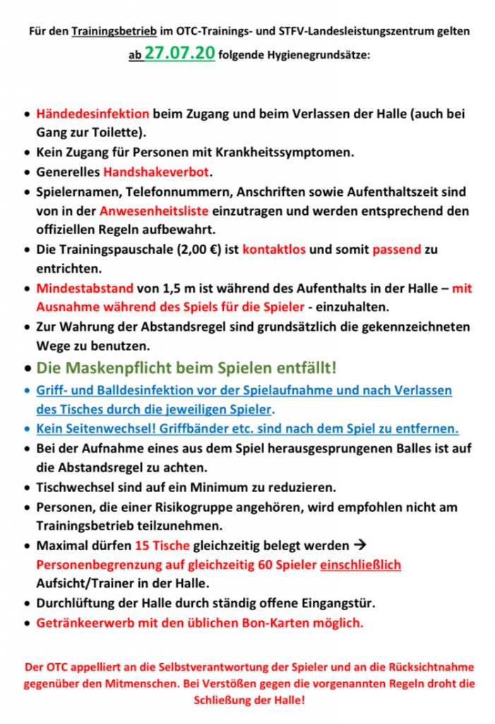 Zwischenzetlich wurden die Hygieneregeln für den Trainingsbetrieb wieder angepasst (Stand 27.07.20) und mehrfach im Eingangsbereich und in der Halle ausgehängt. Die Verantwortlichen von OTC und STFV bitten um Kenntnisnahme und Beachtung.