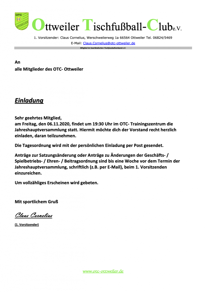 Ebenfalls im Trainingszentrum findet die diesjährige Mitgliederversammlung statt. Termin ist am Freitag, 06.11.20; Beginn ist um 19.00 Uhr. Die Einladungen mit der Tagesordnung werden rechtzeitig versandt und veröffentlicht.