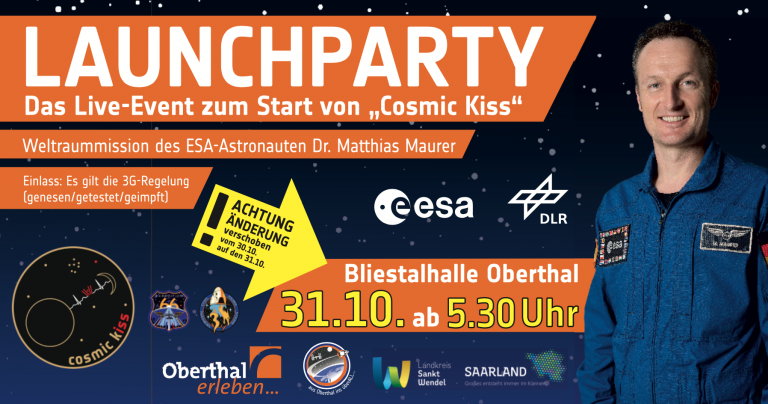 Im Rahmen der Weltraummission #cosmickiss startet Matthias Maurer am 31.10.21 zur ISS. Oberthal und das ganze Saarland feiert seinen Astronauten mit einer öffentlichen Launchparty in der Bliestalhalle am gleichen Tag. „Neben vielen Ehrengästen aus Forschung, Wirtschaft und Politik werden Vertreter der Europäischen Raumfahrt-Agentur (ESA) und dem Deutschen Luft- und Raumfahrtzentrum (DLR) vor Ort sein und viele interessante Aspekte rund um die Mission beleuchten. Neben den vielen Pressevertretern sind auch viele Kamerateams vor Ort, die die Veranstaltung ebenso – teilweise live ins Fernsehprogramm – wie das Radioprogramm des SR3 übertragen. Es gibt tolle Aktionen, ein großes Kinderprogramm sowie viel zu sehen und zu hören. Vor allem aber geht es darum, unseren Saarländer Matthias Maurer zu feiern und live dabei zu sein, wenn er zu seiner Mission startet.“ heißt es in der Infomail. Das Programm verbirgt sich hinter dem Bild – einfach anklicken!