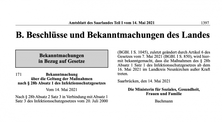 Jetzt ist es offiziell: am 16.05.21 ist die Bundesnotbremse im Landkreis Neunkirchen außer Kraft.