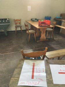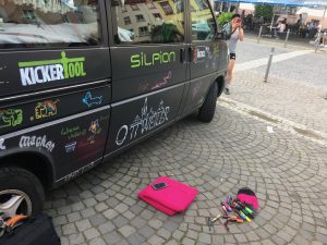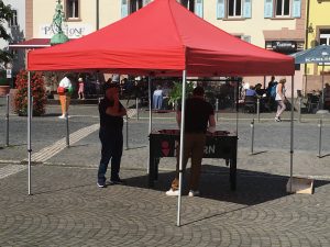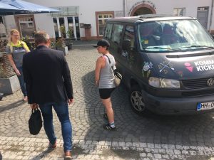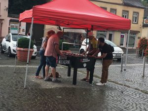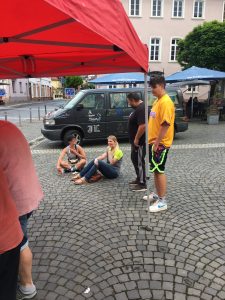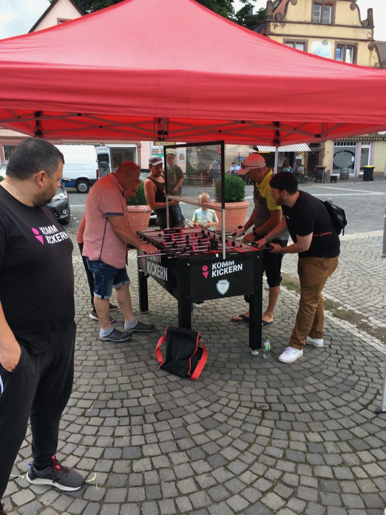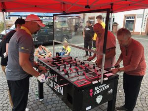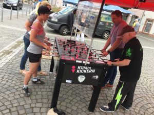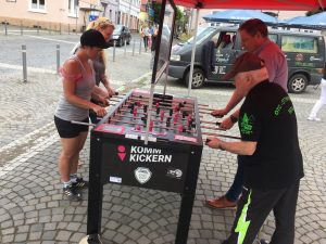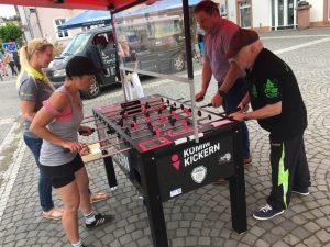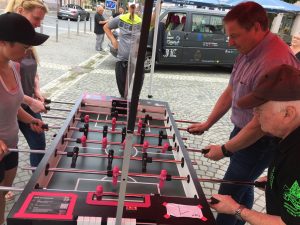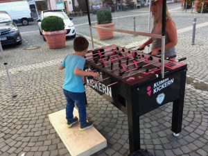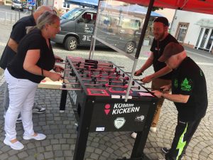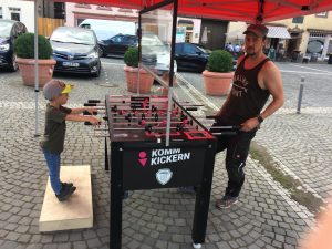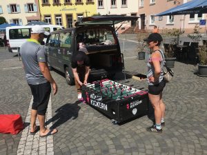 Schnell die Minibus-Klappe auf, und schnell den Kickertisch auf das Kopfsteinpflaster des Ottweiler Schloßhofes gestellt. Schon ging es los! Tischfußball an der frischen Luft.
