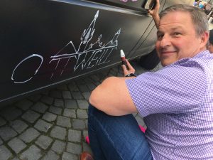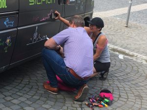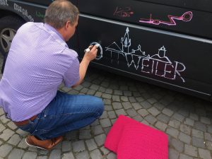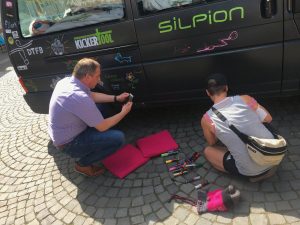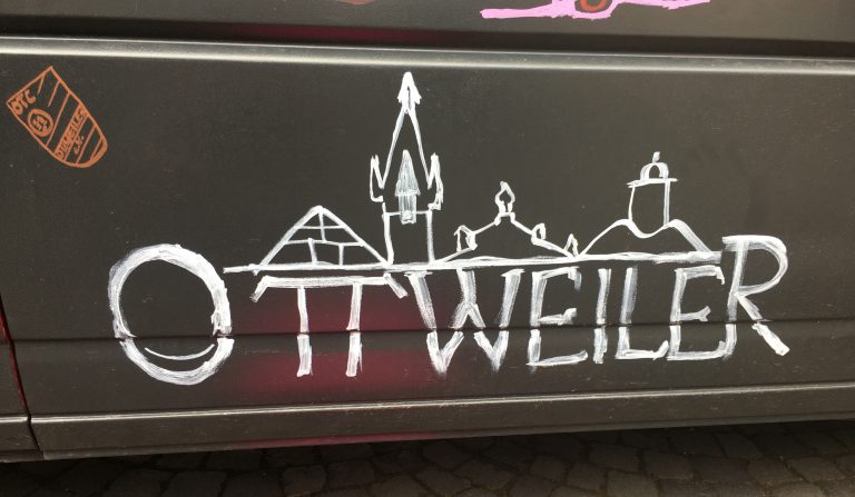 Da staunten die Passanten und die Besucher des Eiscafés und des Bistros auf dem Schloßhof nicht schlecht. Was war denn da los? Nele Neumann und Marc Schweder, beide aus Berlin, sind derzeit auf Deutschlandtour für den Tischfußball unterwegs und legten mit ihrem Kleinbus samt Kickertisch einen Halt in Ottweiler ein. Bürgermeister Holger Schäfer schaute vorbei. Aber nicht nur das. Er kam der Einladung zum Mitspielen nach und malte, ebenfalls auf Einladung, das Logo der Stadt auf den Kleinbus. Den Bus zieren schon etliche andere Logos, von verschiedenen Städten, Sportvereinigungen und Sponsoren. Alle sind handgemalt, so wie das Ottweiler Logo.
