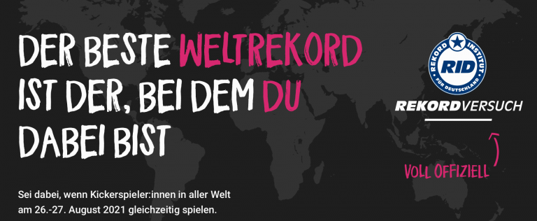 Am 26./27.08.21 veranstaltet „Komm Kickern“ einen weltweiten und offiziellen Weltrekordversuch. Als Teil der großen Tischfußballfamilie ist der OTC Ottweiler e.V. selbstverständlich mit von der Partie. Unter dem Motto „Der beste Weltrekord ist der, bei dem du dabei bist“ starten am Donnerstag, 26.08.21, um 20.00 Uhr gleich 2 Turniere im OTC Trainings- und STFV Landesleistungszentrum. Bis 22.00 Uhr wird jeweils an Hansberg- und an Leoharttischen ein Monster Dyp ausgespielt. Teilnehmen kann jeder. Voraussetzung ist lediglich der Download der „Komm Kickern App“ sowie die anschließende Registrierung zur Ermittlung der weltweiten Teilnehmerzahl. Die Teilnahme ist selbstverständlich kostenlos. Jeder erhält eine Teilnahmeurkunde des Rekord-Instituts. Alle Details gibt es unter https://komm-kickern.de/worldrecord/.