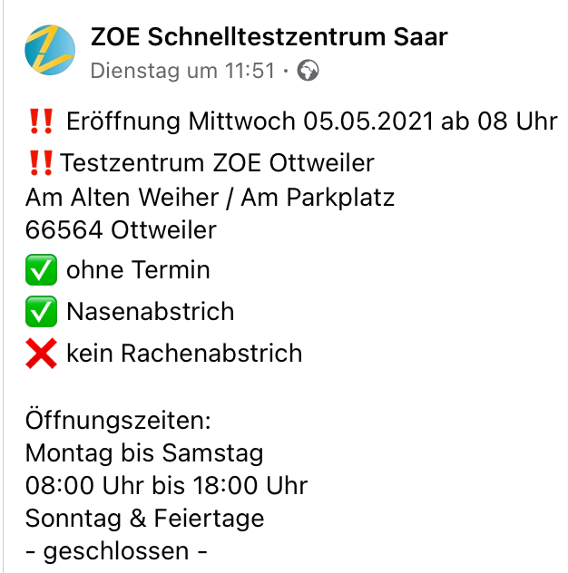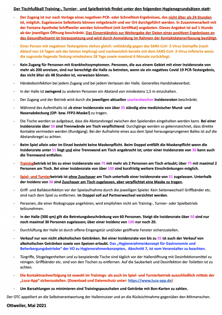 Darüber hinaus besteht auch weiterhin die Möglichkeit zum Test im OTC Trainings- und STFV Landesleistungszentrum unterstützt von der Fontane Apotheke Schiffweiler. Übrigens sind die Schlüsselanhänger zur „Luca-App“ beim Landkreis eingetroffen und bei vielen Gemeindeämtern erhältlich. Das vollständige Hygienekonzept ist unter https://otc-ottweiler.de/wp_otc_1974_itsf/wp-content/uploads/2021/05/2021_TZ-Hygienkonzept_Mai_Seite1.pdf abrufbar. Daumen drücken!!!