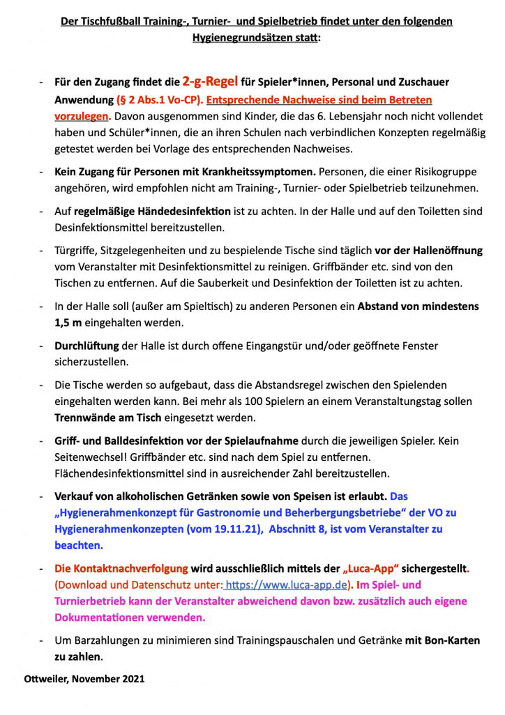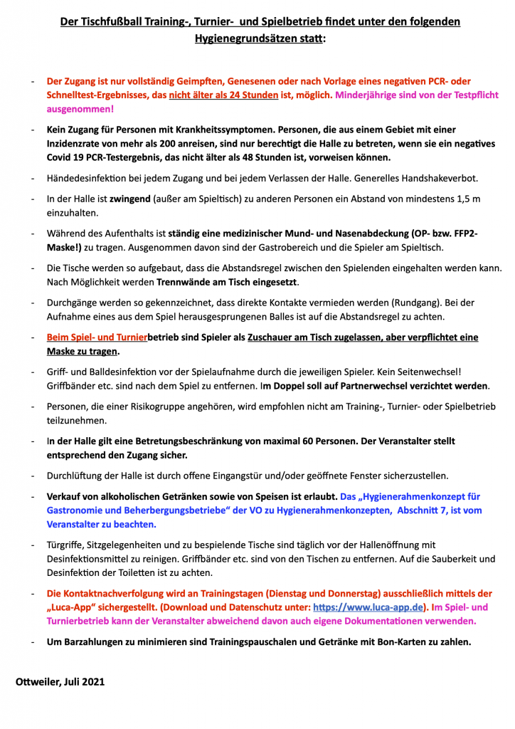 Die Verantwortlichen des OTC Ottweiler e.V. und STFV e.V. wagen nach der langen Abstinenz mit der Öffnung einen ersten Schritt zur Ausübung des Tischfußballsports. Weitere Schritte sollen bei sinkenden Inzidenzraten folgen. Das Hygienekonzept bietet dazu als Basis so viel Sicherheit wie aktuell möglich und gleichzeitig angepasste und verhältnismäßige Lockerungsschritte zu mehr „Normalität“. Die Öffnung macht natürlich nur Sinn wenn die Sportler die Möglichkeit auch nutzten. Die anstehenden Bundesliga- und Turniertermine sollten Anreiz genug sein.