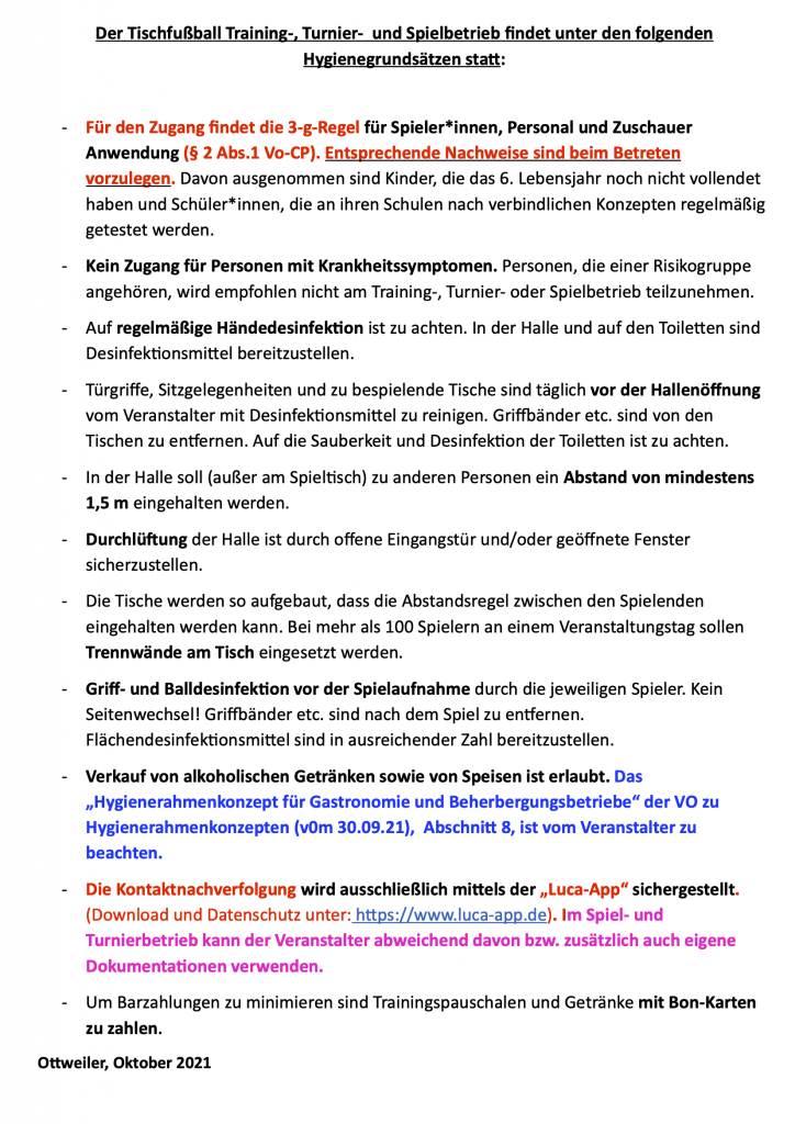 Am 30.09.21 wurde die Corona-Verordnung angepasst. Im OTC Trainings- und STFV Landesleistungszentrum werden die Änderungen ab dem 05. Oktober in einem aktualisierten Hygienekonzept umgesetzt. Wie schon bisher wird die 3-g-Regel und die Kontaktdatenerfassung per Luca-App angewandt. Allerdings entfällt nunmehr in Gänze die Maskenpflicht in der Halle. An die Desinfektion der Griffe usw. vor dem Spiel insbesondere im Turnier- und Spielbetrieb wird erinnert. Die weiteren Einzelheiten hier zum abspeichern: