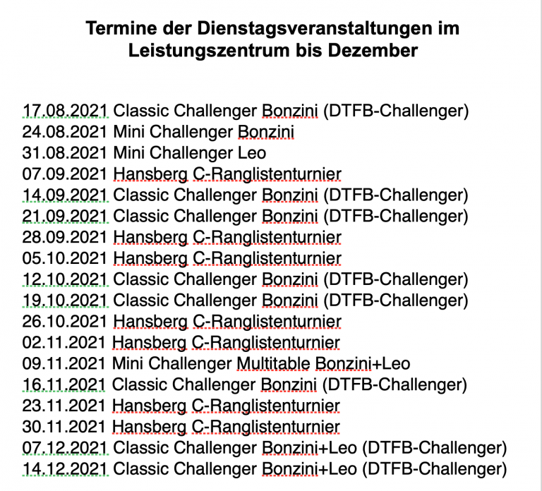 An den beiden folgenden Donnerstagen bleibt das OTC Trainings- und STFV Landesleistungszentrum geschlossen. Am 02.09.21 startet das Leo-WS in St. Wendel, so dass eine Öffnung wenig Sinn macht. Am darauf folgenden Donnerstag, 09.09.21, bleiben die Türen wegen den Vorbereitungsarbeiten für eine private Veranstaltung geschlossen. Dienstags ist natürlich (mit Jugendtraining) geöffnet. Das Bild zeigt die geplanten Dienstagsturniere.