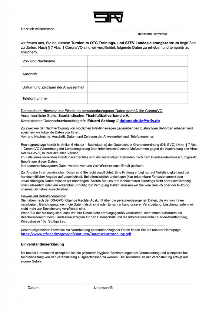 Die wichtigste Änderung betrifft die Turniere und den STFV-Spielbetrieb, der nach den Sommerferien starten soll. Für Turniere und Spieltage im Trainingszentrum erfolgt die Kontaktdatenerfassung nicht über die Luca-App. Von den Teilnehmern ist jeweils folgendes  Formular auszufüllen. Hier geht’s zum Download. Im Trainingsbetrieb findet weiter die Luca-App Anwendung.