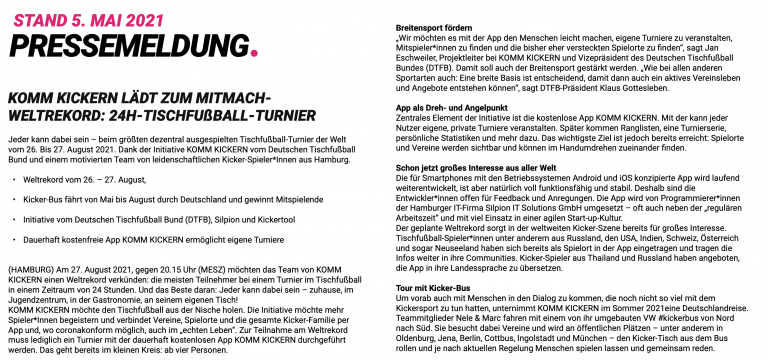 Die Rundfahrt soll auf den Weltrekordversuch am 26. und 27.08.21 aufmerksam machen, der von den Verantwortlichen wie folgt beworben wird: #kommkickern
